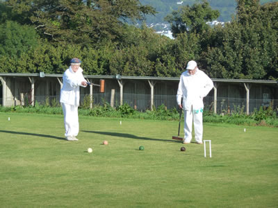 In Block 1, the luck of the draw resulted in the Chairman playing, and getting, the first competed hoop on lawn 3. Block 1 players had 5 games on Saturday, 3 on Sunday. Block 2 played 4 on each day. As the block games neared their conclusion, Kathleen Moorshead in Block 2 had a perfect set of wins, but needed to beat Elizabeth Schofield, a previous winner also very much in contention, in her final game to reach the final. A tense and carefully played game finally resulted in a 5-4 win for Kathleen. In Block 1, Peter Dexter was playing consistently well, and demonstrating his ability to make reliable jump shots. However, he lost to David Edwards in a good and quite rapid-fire game, but won the block by a half point from Edwards.